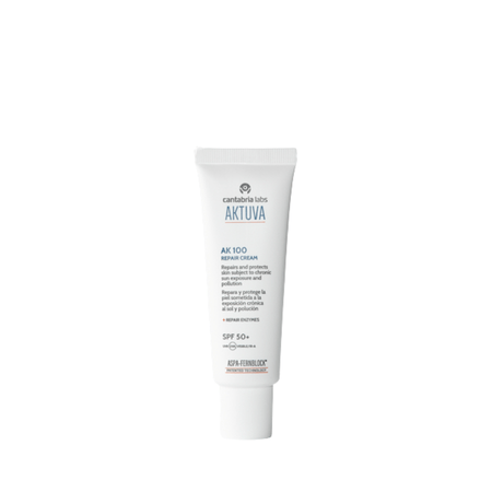 AKtuva AK100 Repair Cream SPF 50+ 50 ml de Cantabria Labs es la crema reparadora de uso médico-dermatológico diseñada específicamente para el tratamiento de soporte de la queratosis actínica y el campo de cancerización. Una fórmula de alta tecnología que actúa en dos frentes simultáneos: repara el daño actínico acumulado en el ADN celular y protege la piel frente a nuevas agresiones solares con una fotoprotección de muy alta eficacia.