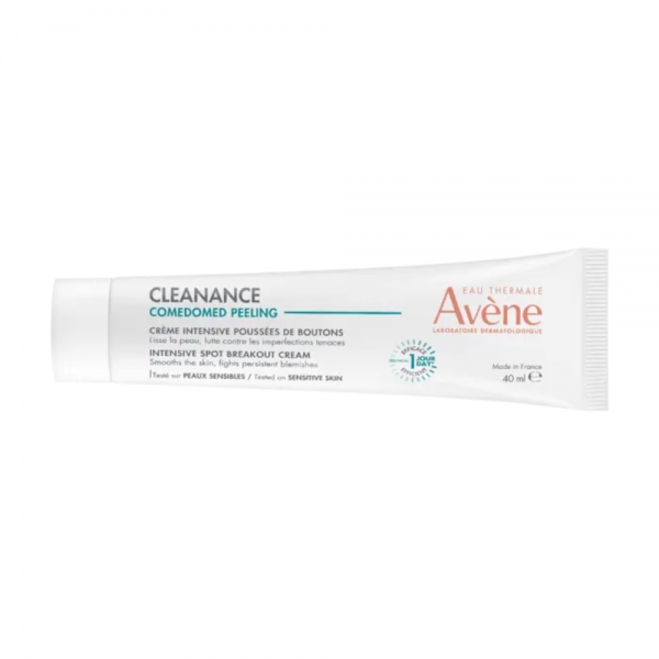 Avène Cleanance Comedomed Peeling 40 ml es un tratamiento intensivo pensado para actuar cuando aparecen imperfecciones/brotes. Combina ácido glicólico (acción queratolítica/exfoliante) con Retinoid Booster (combinación con retinal y Comedoclastin™ procedente de cardo mariano) para favorecer la reabsorción de granos y ayudar con marcas residuales. Indicado para adolescentes y adultos con piel acneica; se aplica sobre piel limpia y seca y está planteado como uso puntual con máximo 15 días.