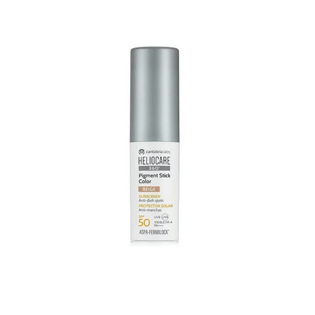 Heliocare 360º Pigment Stick SPF 50 Beige 10 g de Cantabria Labs es el fotoprotector en formato barra de aplicación localizada, diseñado específicamente para proteger y corregir las zonas del rostro con manchas, melasma o hiperpigmentación. Una solución única que combina tratamiento despigmentante, color corrector y protección solar 360º en un solo producto de bolsillo.